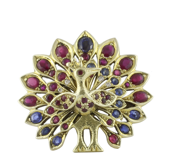 Blue Sapphire, Ruby, Emerald, Yellow Sapphire and Diamond Brooch